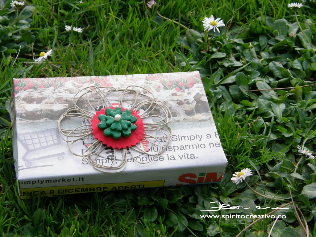 Questa è la fase finale, al termine della realizzazione dell’oggetto, devi chiuderlo in una scatola o in un sacchettino …. La puoi comprare e poi la decori con nastri, perle, strass etc, oppure, puoi utilizzare il cartoncino, la carta dei quotidiani etc … : dipende da chi riceve il regalo, non a tutti piace l’handmade. E comunque rappresenta il “bigliettino da visita” e non va sottovalutato.