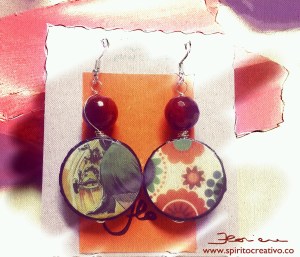 La casualità … chi l’avrebbe detto che una pagina strappata da un volantino sarebbe diventata un orecchino. Ricordo che, mi colpirono quelle espressioni sul volto e i colori accesi di quella stampa, tornai a casa e pensai a come poterli trasformare in orecchini. Un pò di sughero, colori per il contorno, patine protettive e pietre. Non sapevo nulla del film, me lo dissero le clienti quando riconobbero i personaggi stampati … poi da lì, a pochi giorni di distanza andai al cinema all’aperto vicino casa, guarda caso stavano trasmettendo quel film e corsi a vederlo …. Bellissimo e capii perchè fosse così famoso. Purtroppo queste sono le uniche foto che sono riuscita a scattare prima di venderle … non mi è rimasto neanche un pezzo, perchè a saperlo, magari uno me lo sarei tenuto per me 🙂