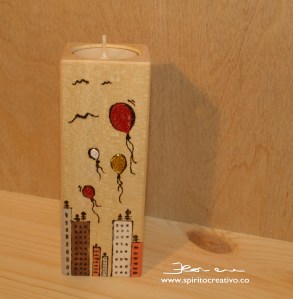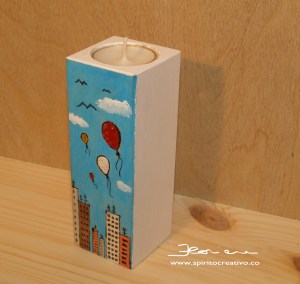 in questa versione non abbiamo più il legno a vista, i colori acrilici sono stati utilizzati su tutta la superficiePortacandela tea light: in questo progetto mi sono divertita utilizzando il pirografo delineando i palazzi con finestre e antenne, i palloncini e i gabbiani. Ho utilizzato i colori acrilici ben diluiti nell’acqua ed ho aggiunto un pò di glitter evidenziando l’elemento “aria” (palloncini)